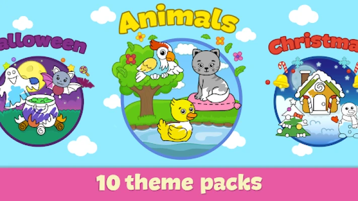 - Baby drawing with 10 themes: animals, dinosaurs, dolls, school, music, cars, food, Halloween, Christmas and ocean.